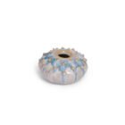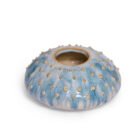Handbuilt, white stoneware clay, textured, glazed.